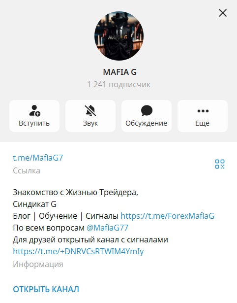 MafiaG7 — это Telegram-канал, предлагающий сигналы для торговли на платформе Pocket Option. ([ ]( Судя по всему, MafiaG7 — это очередной канал с сигналами для Pocket Option. Сигналы, как всегда, «точные», а результаты «гарантированные». Но, как показывает практика, такие проекты часто оказываются пустышками. Не ведитесь на красивые обещания и помните: бесплатный сыр бывает только в мышеловке.