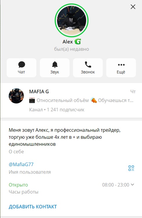 На данный момент автор продвигает несколько Telegram-каналов, включая MafiaG77 и ForexMafiaG. Проект активно ведется, судя по регулярным публикациям. Алекс позиционирует себя как практикующего трейдера, который делится готовыми решениями. Он рассказывает об успехах в виде скриншотов сделок и заявлений о прибыли, призывая подписчиков повторять его действия для быстрого заработка.