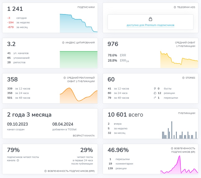 При этом данные статистики вызывают вопросы. Несмотря на более 1200 подписчиков, средний охват публикаций составляет около 350 человек, а вовлеченность аудитории низкая. Показатель ERR в 3.2% считается слабым для канала такого размера. Это может косвенно указывать на неорганический, возможно накрученный, характер части аудитории. Резкие колебания в количестве подписчиков, отмеченные в статистике, также добавляют сомнений в их качестве.