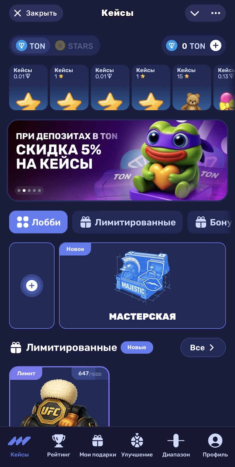 Далее стандартной стартовой командой запускаем самого ТГ бота Majestic Gift. В открывшемся окне видим множество кейсов с разной стоимостью.