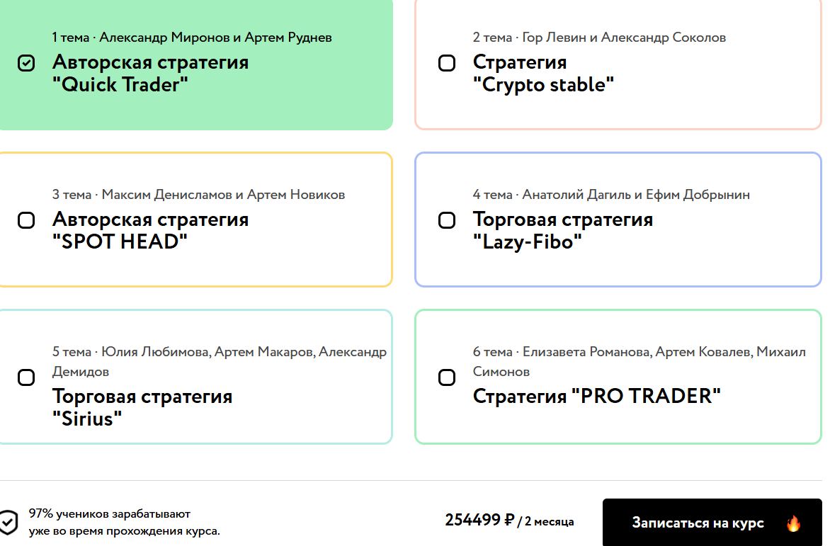 На сайте есть программа курсов о криптовалюте Максима Денисламова, однако она содержит мало деталей. «Гуру» обещает рассказать о неких «авторских торговых стратегиях», но не сообщает, какая конкретно информация ждет ученика. Таким образом, тот должен приобрести «кота в мешке». Цена вопроса при этом является очень высокой — 200 тыс. руб. за 2 месяца.