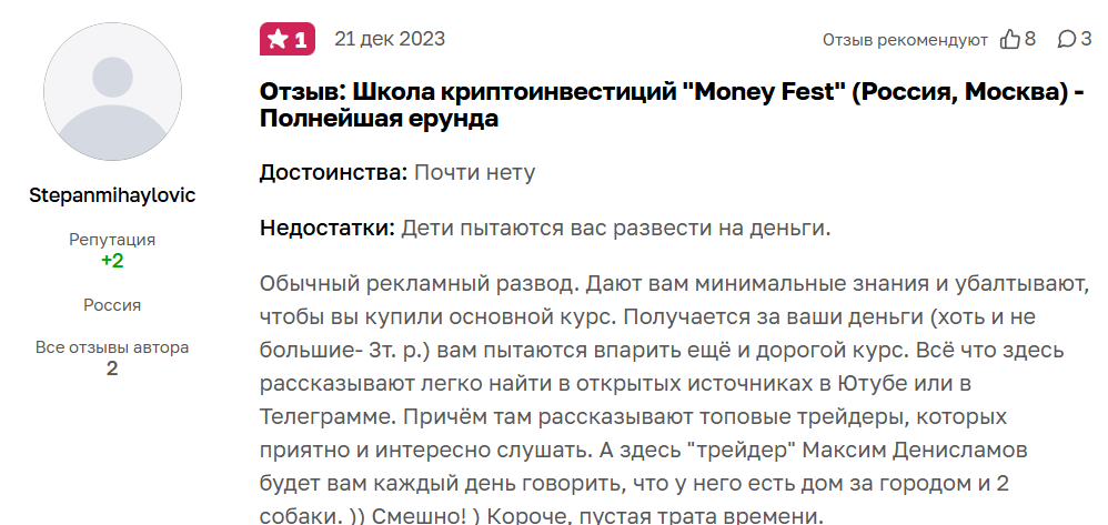 На своем личном сайте Money Fest Максим Денисламов сообщает, что он специалист в области криптотрейдинга, успешный трейдер и автор курсов по этой теме. Однако такие «регалии» может «присвоить» себе каждый желающий. Мы не видим никаких подтверждений того, что у Максима есть реальный опыт в чем бы то ни было в сфере финансов. В интернете крайне мало ссылок на этого «гуру», и все они ведут на его личные страницы и блоги. Таким образом, он лишь изображает из себя эксперта, но не является им в действительности.