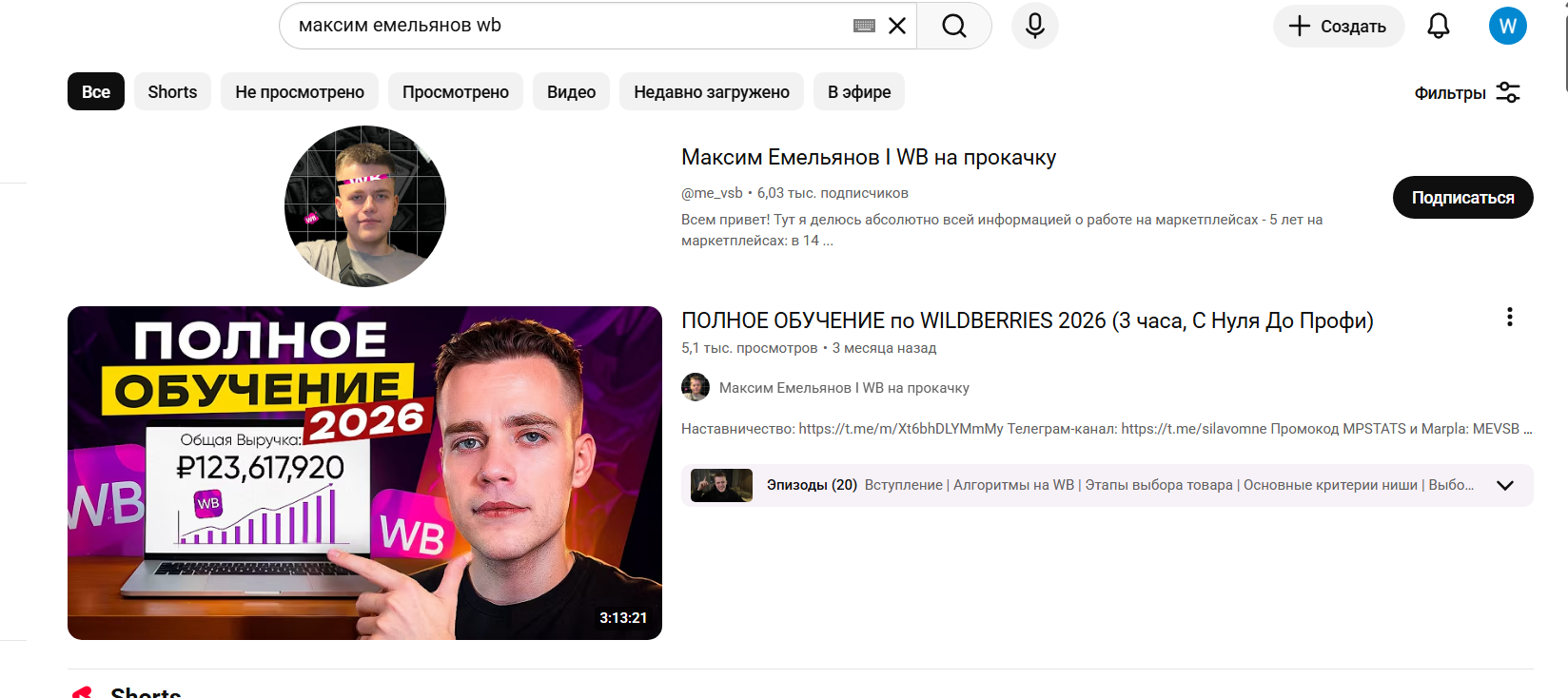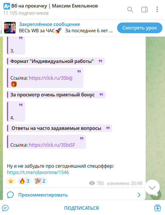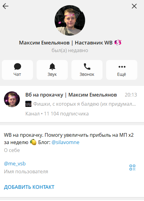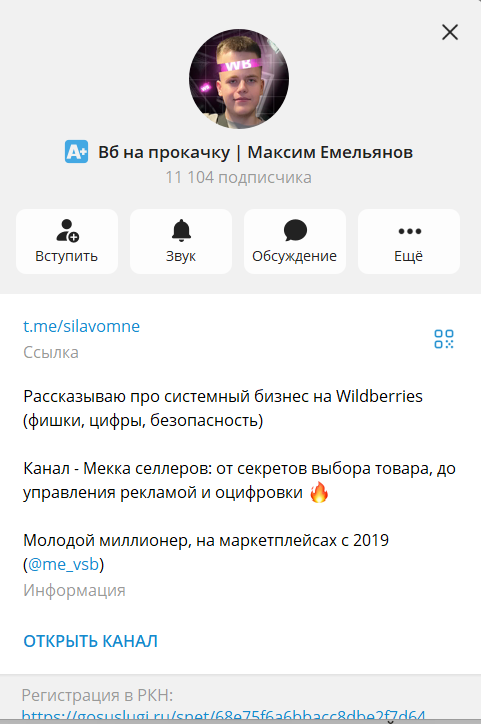 Проверка цифрового следа показывает, что основная база подписчиков аккумулируется в Telegram-канале Silavomne, который насчитывает более 11 000 участников. Канал ведется под брендом «Вб на прокачку | Максим Емельянов».