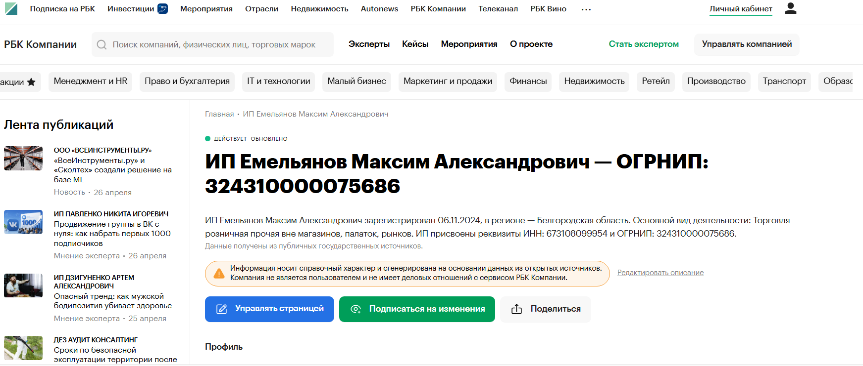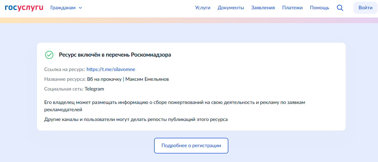 Емельянов часто демонстрирует ссылку на регистрацию своего проекта в РКН, но она не заменяет официальное оформление бизнеса в соответствии с законодательством РФ.