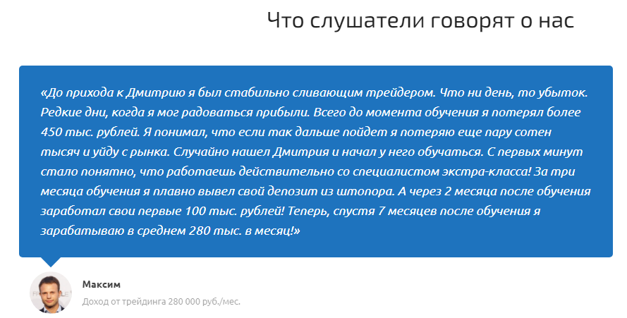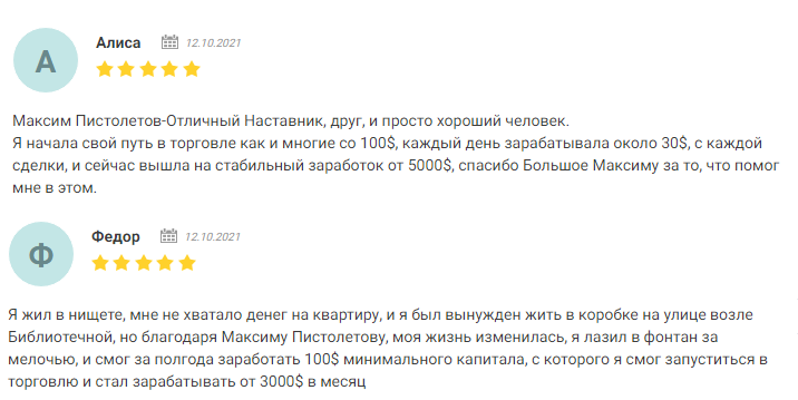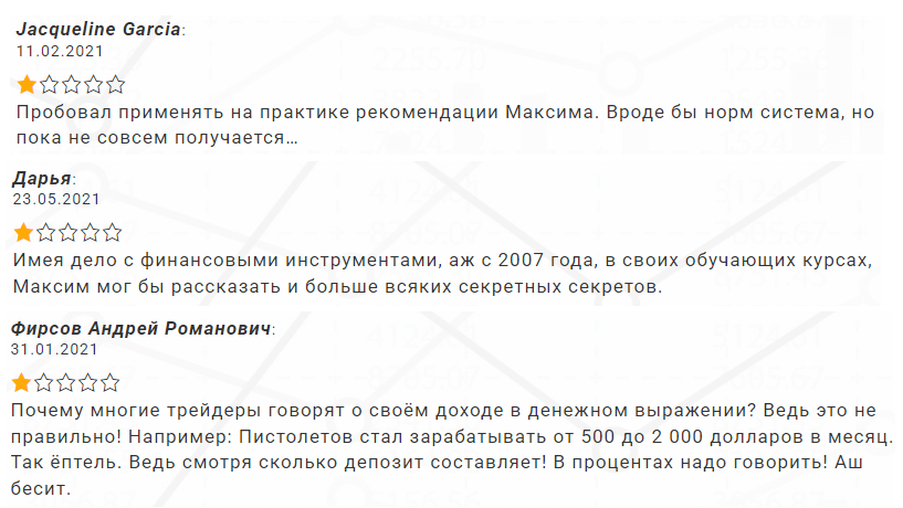В интернете можно встретить положительные отзывы студентов курса Максима Пистолетова под названием «FOREX на автопилоте». Люди заявляют, что остались довольны обучением и смогли увеличить доход.