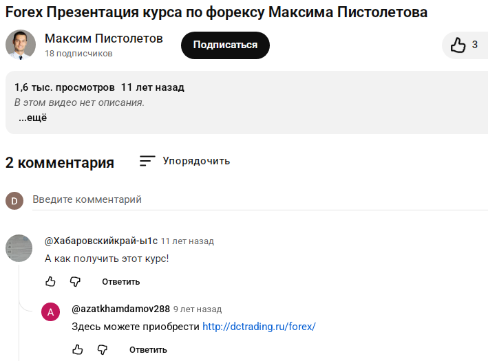 Под роликом Максим приглашает аудиторию посетить официальный сайт онлайн школы трейдинга Dctrading ru.