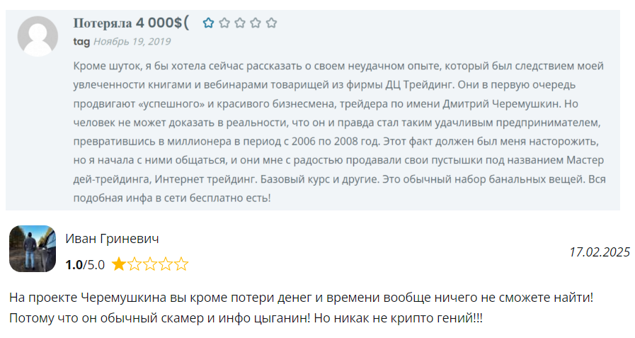 - в интернете опубликовано огромное количество негативных комментариев о трейдинг школе Dctrading и ее владельце Дмитрии Черемушкине;