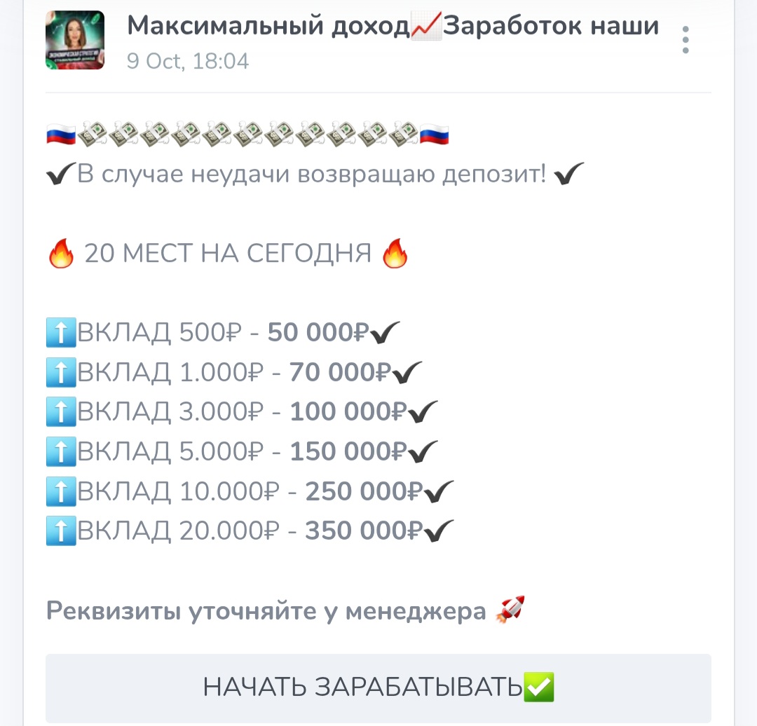 Через канал в ТГ “Maksimalnyj dohod zarabotok nashim” предлагают легкий заработок без рисков. Но в ходе его анализа мы обнаружили ряд признаков, характерных для скам-проектов: