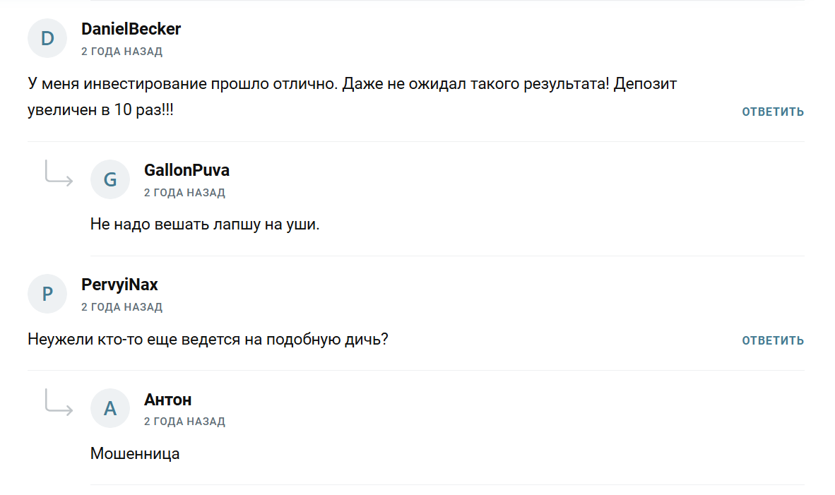 Этот так называемый «Максимальный доход» — просто очередная ловушка для доверчивых людей. Обещания баснословных прибылей с минимальными вложениями — это классический прием мошенников. Скриншоты «успешных» сделок и банковских переводов легко подделать, а видеоотзывы, скорее всего, куплены у фрилансеров. Никакой реальной торговли не ведется, а деньги инвесторов просто исчезают. Не дайте себя обмануть этим аферистам!