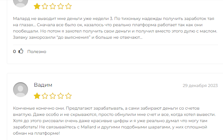 Все признаки проекта без официальных данных указывали на то, что финансовая площадка является только маскировкой. Такие однодневки дублируются с различными дизайнами, однако схема остается идентичной. Найденные отзывы о Маллард единодушно подтверждают — руководители платформы не давали вывести деньги.