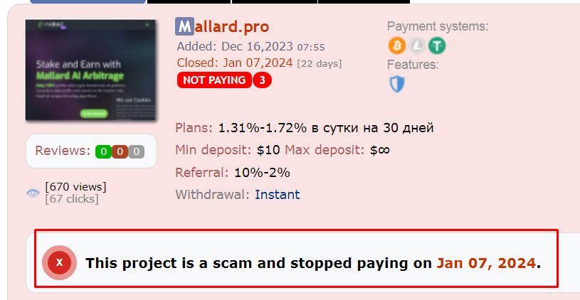 Mallard Pro обещает эксклюзивные инвестиционные возможности, но на деле это очередная ловушка для доверчивых инвесторов. Обещания высоких доходов без риска — классический признак финансовой пирамиды. Отсутствие прозрачности и реальных гарантий делает этот проект крайне сомнительным.