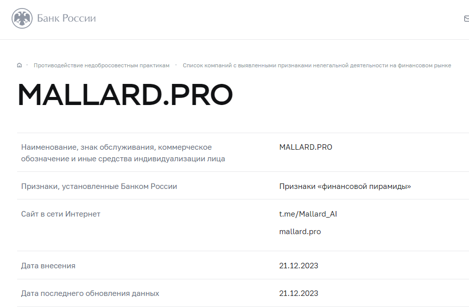 Mallard Pro — очередная ловушка для доверчивых: анонимные владельцы, отсутствие лицензий и обещания баснословных доходов. Не дайте себя обмануть!