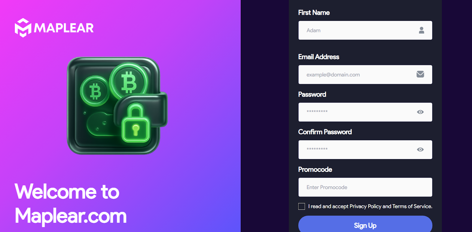 Проект работает через веб-площадку maplear com, доступную на английском языке. Из разделов есть только “Вход” и “Регистрация”. Платформа оформлена точно так же, как и многие другие кошельки.