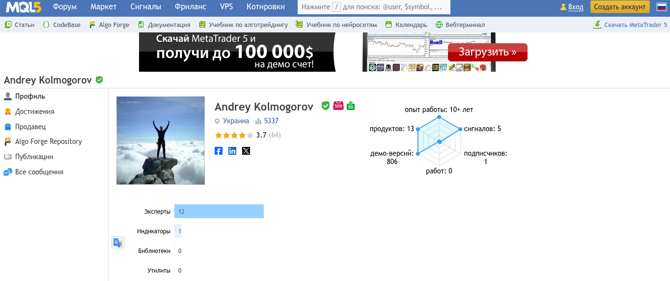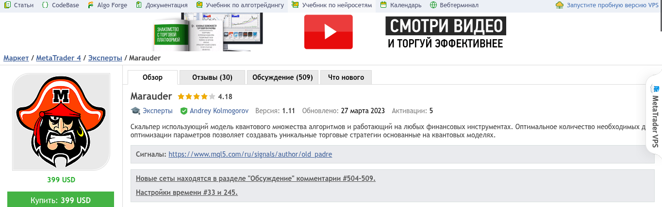 На форуме автор более 10 лет и за это время представил комьюнити более 800 продуктов. На данный момент автор крипта индикатора «Мародер» разместил на продажу 13 продуктов. Еще есть верификация на портале.