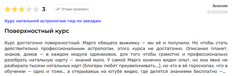 Марго просто ужасно составила свой курс астрологии. Очень мало конкретики, все скомкано и непонятно. Считаю стоимость курса намного завышенной. Не стоит оно того, после обучения реальных знаний ноль.