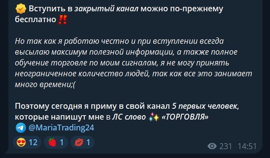 Телеграмм-канал Мария Торговые будни: отзывы подписчиков, обзор и проверка MariaTrading24