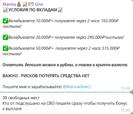 Как пишут пользователи в отзывах на Тг-канал Marina One и его клоны, автор занималась разводом аудитории. Схема состояла в следующих этапах: