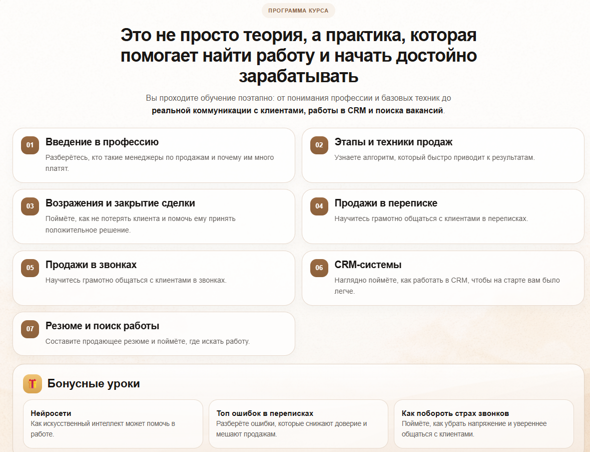 Программа курса от Maria Marten состоит из разбора особенностей коммуникации с клиентом и работы с CRM-системой: