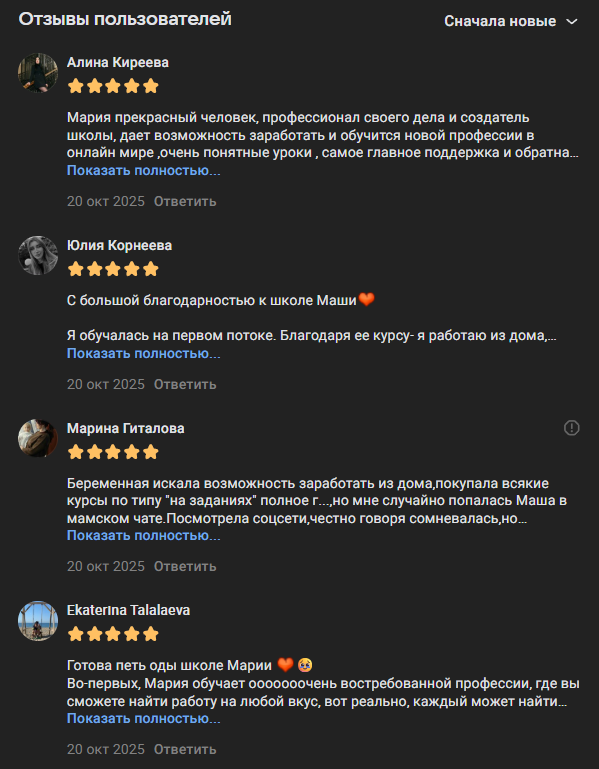 Отзывы об онлайн-школе Марии Мартен представлены в ее сообществе в ВК, выпускники ставят проекту высокую оценку. Но в то же время заметим, что многие рецензии выложены одним днем, это может указывать на накрутку.
