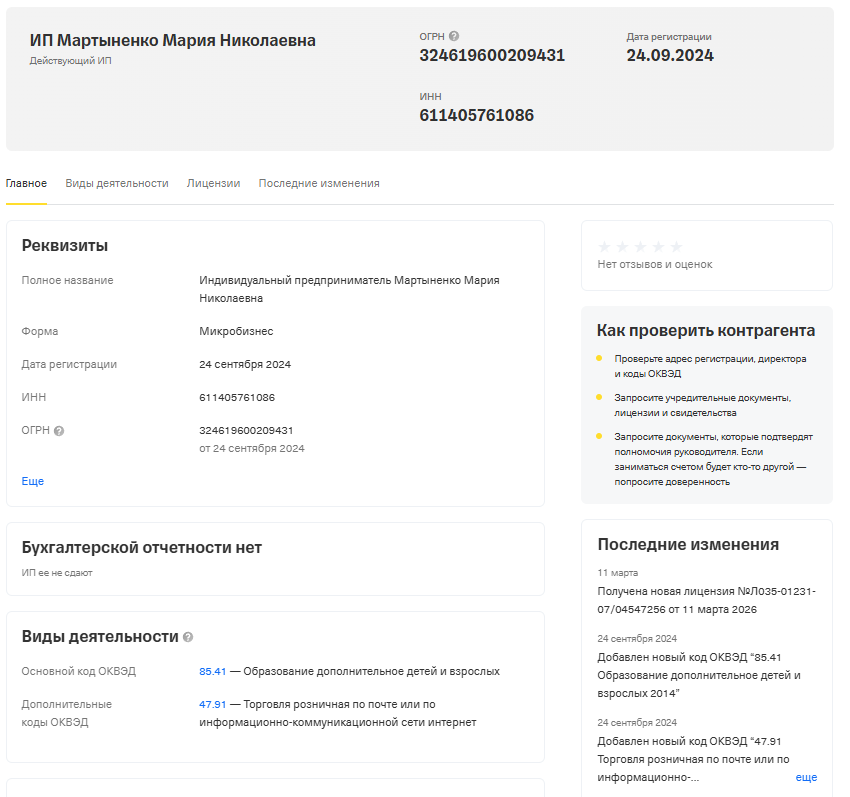 У онлайн-школы девушки есть регистрация, помимо необходимых кодов деятельности у проекта имеется лицензия: