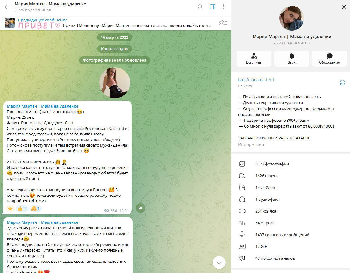 Канал девушки в Телеграм – одна из самых активных социальных сетей. Он начал работу в 2022 году, изначально это был блог о материнстве, но с 2024 девушка стала посвящать публикации заработку на удаленке.