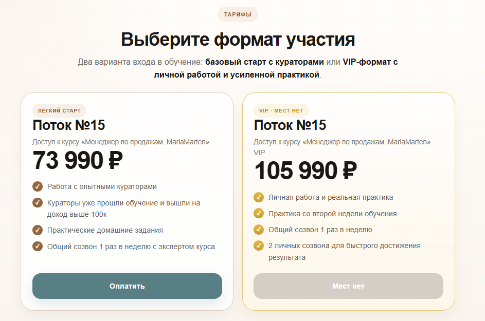 Программа представлена в 2 тарифах: Легкий старт за 73 990 рублей и VIP за 105 990 рублей. Насколько в действительности обучение от автора может быть актуальным и полезным – большой вопрос. Опыт самой Марии ничем не подтверждается.