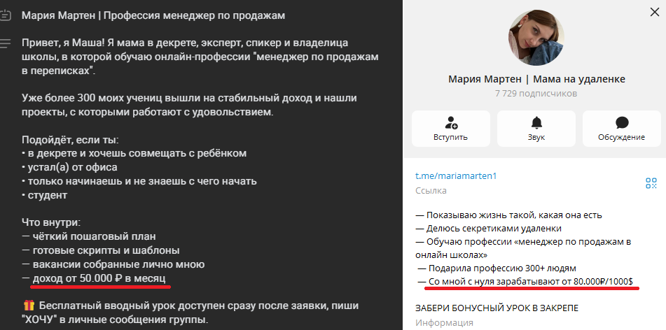 В блогах Мария рассказывает о том, что полученные знания позволят выйти ученикам на стабильный доход. При этом пользователей привлекают именно рассказами о гарантированном доходе. В ВК рассказывается о зарплате от 50 тысяч рублей, а вот в Тг уже от 80 тысяч. Заметим, что подобный подход может быть не самым честным, ведь гарантировать определенный доход нельзя, он зависит от множества факторов.