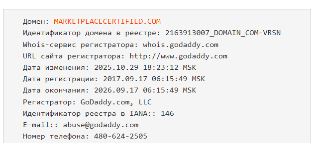 - Отсутствие на сайте MarketPlaceCertified com базовых юридических документов и соглашений лишает трейдера возможности отстаивать свои права в спорных ситуациях, что делает любые вложения крайне рискованными.