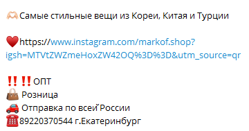Markof Shop — очередной телеграм-магазин, где владелица скрывает лицо, а происхождение товаров окутано тайной. Почти 5 тысяч подписчиков, но реакции на посты едва достигают 10 — явная накрутка. Отсутствие отзывов и закрытые комментарии только подтверждают сомнительность проекта. Покупка здесь — игра в «рулетку» с высокими шансами остаться без денег и товара.
