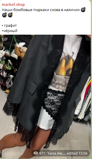 В одном из постов Яна демонстрирует черные пиджаки. Вместо фото она использует видео, это позволяет покупателю изучить изделие со всех сторон.