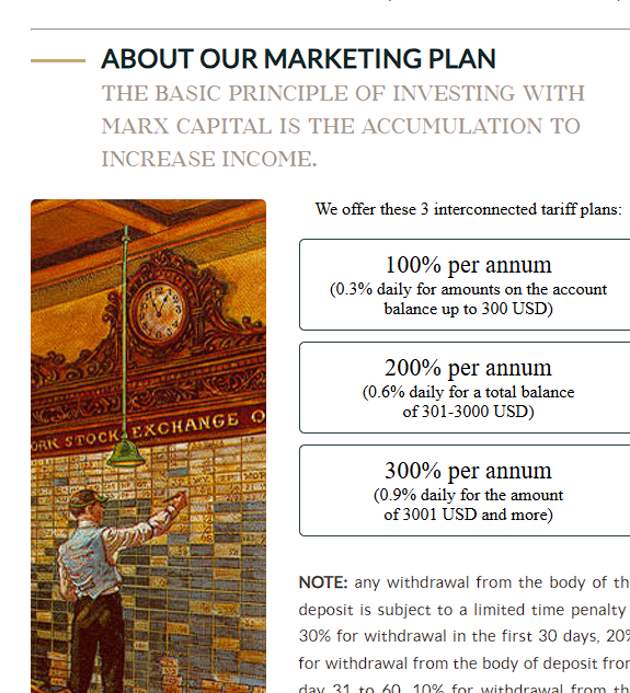 Обещания по прибыли в Marx Capital выглядели так. Если вложить до $300, клиентов якобы ждали 100% годовых или 0,3% в день. Если $300-3000, ставка поднималась в 2 раза, а если от $3001 – то в три. При этом пополнить счет или перейти на другой тариф можно было в любой момент: начать с $300, через месяц добавить до $400 и так далее.