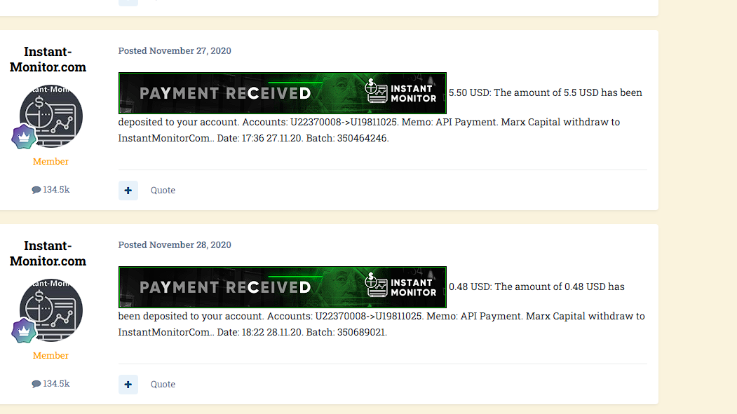 Дальше тема превращается в ленту уведомлений о выплатах. Там публикуют скриншоты транзакций из Perfect Money с суммами в $2-15, изредка больше. Выплаты идут регулярно, несколько раз в неделю или даже ежедневно. Под ними поясняется, какая это прибыль – по партнёрской программе или начисления по депозиту.