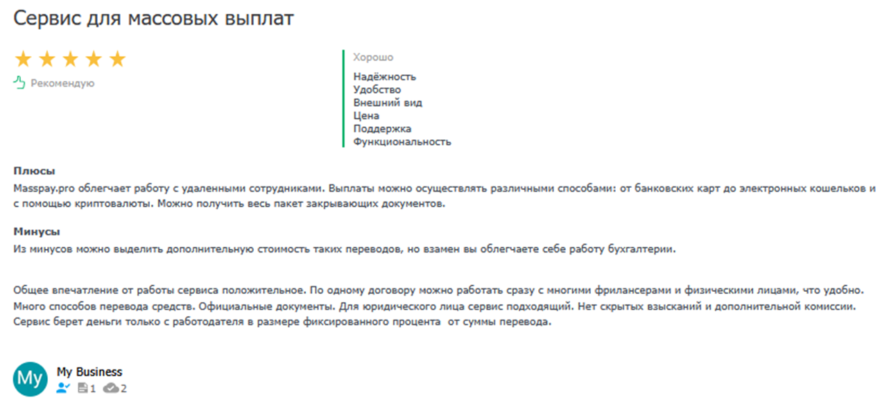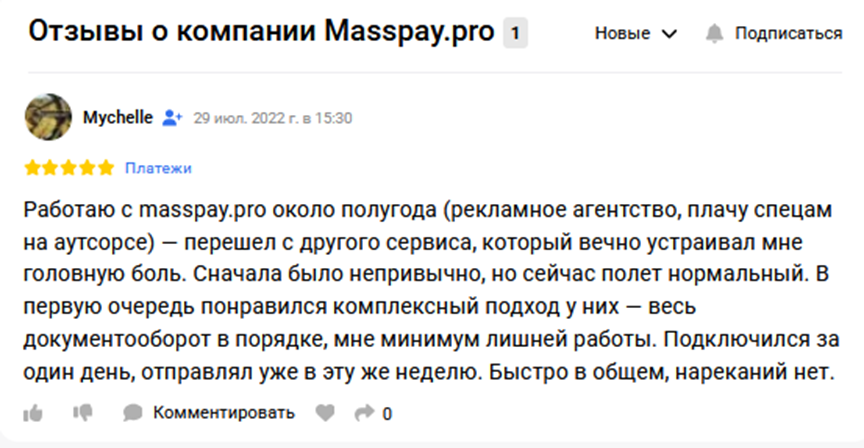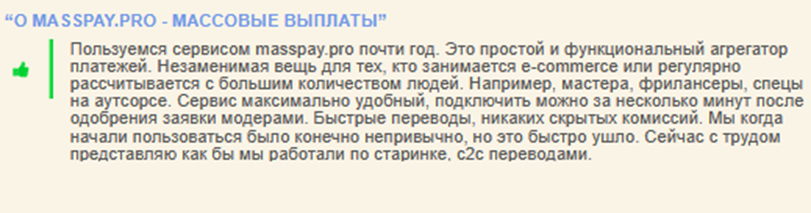 Независимые отзывы о работе MassPay Pro преимущественно положительные. Клиенты платежной системы говорят об удобстве сотрудничества, низких комиссиях и гибкости предлагаемых решений.