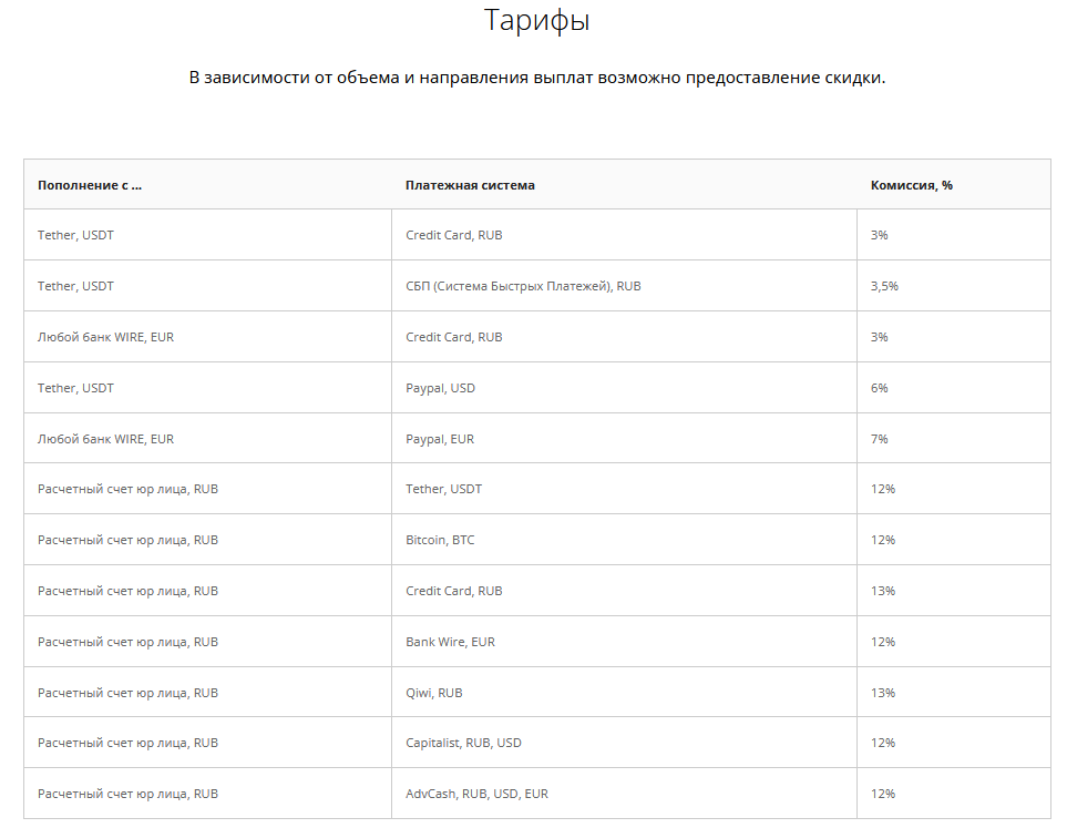 Тарифы зависят от выбранного направления и валюты. При работе с криптой комиссия начинается от 3%, для банковских переводов – от 3-7%. Есть возможность выплат через СБП, комиссия в этом случае составляет 3,5%. Для расчетных счетов в российских рублях размер комиссионных равен 12-13%, точное значение зависит от используемой платежной системы.