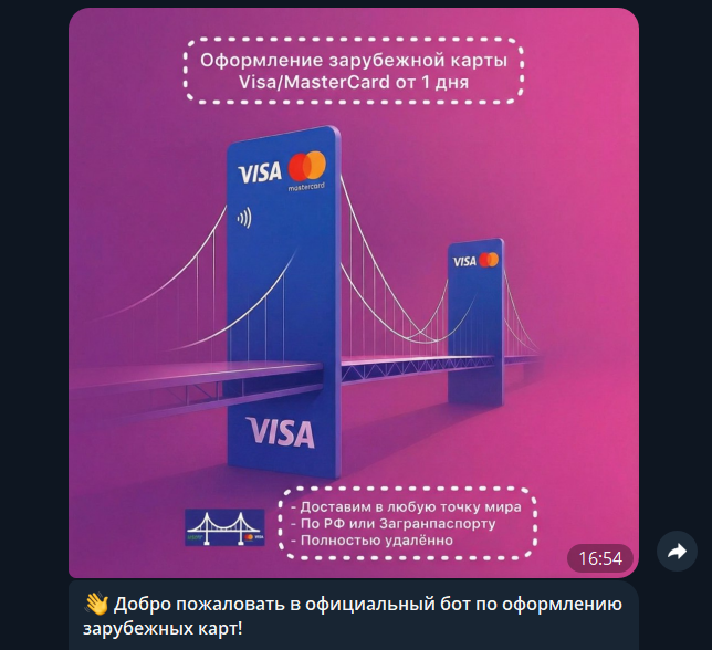 MasterCard Bridge — сайт и бот в Телеграмме, через которых жителям России предлагают оформить иностранную банковскую карту. Его владельцы обещают низкие цены на услуги и карты, которыми можно расплачиваться в интернете или платить в путешествиях.