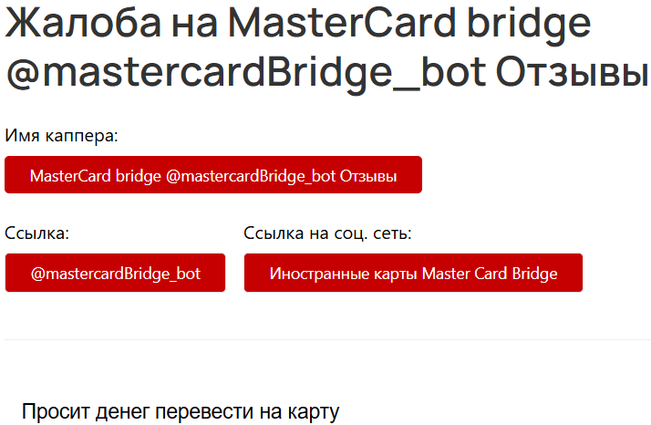 На независимых ресурсах остался всего один отзыв о боте Мастеркард Бридж, в нем говорится о том, что сервис просил перевести деньги на карту. Подробностей нет, неизвестно, о чем вообще идет речь.