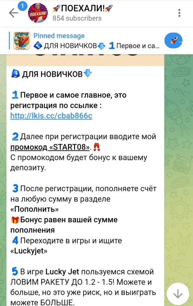 Max_Start08 – это ссылка на личный чат администратора Телеграм-канала Поехали, где основной контент посвящен заработку в азартной игре Lucky Jet. В закрепленных постах размещены пошаговые инструкции, промокоды и ссылки для регистрации. Максим Ракета делает акцент на публикации крупных выигрышей и сообщений о выводах. При этом о рисках он пишет вскользь, что формирует у аудитории искаженное представление о возможных результатах.
