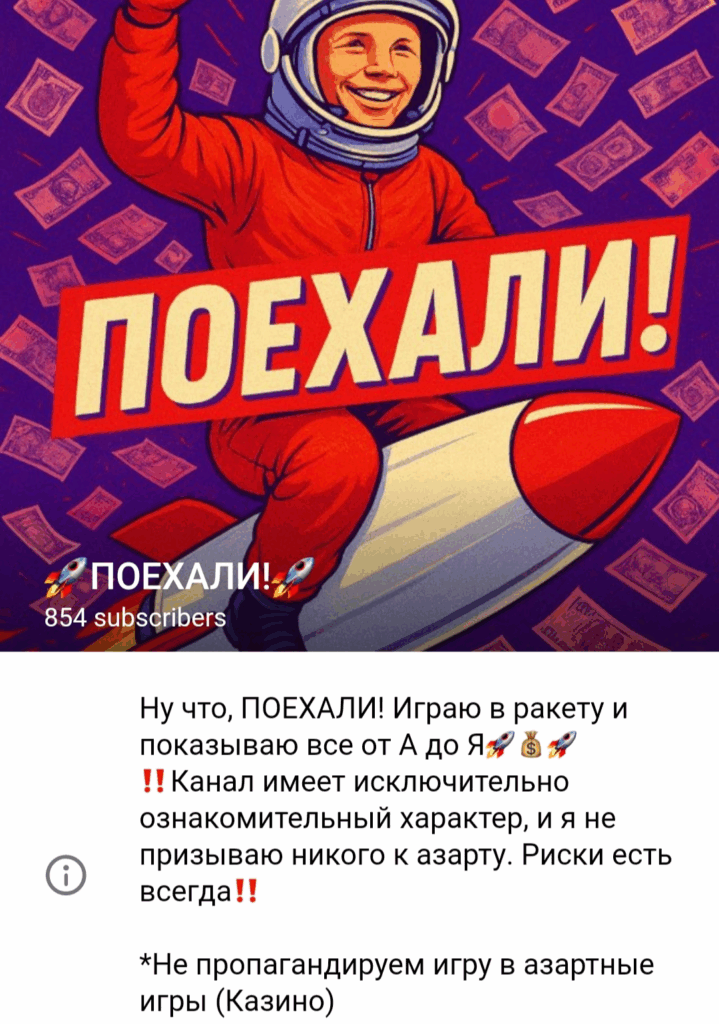 На момент проведения нашей проверки 20 сентября 2025 года паблик Поехали удален, но личный чат Максима Ракеты @max_start08 еще работает. Блогер продолжает продвигать свою стратегию выигрыша в Lucky Jet, которая приводит только к сливу банка.