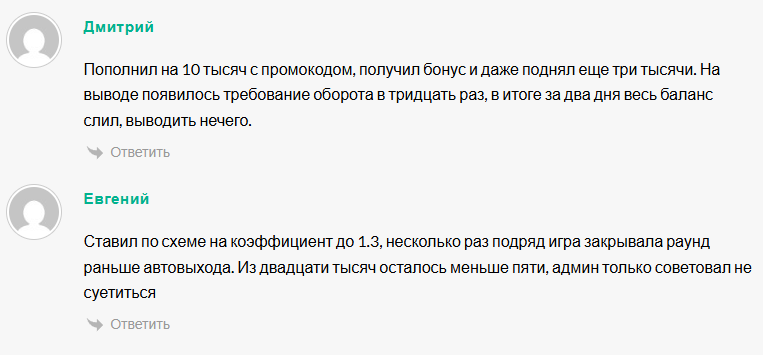 Отзывы клиентов об игре по ссылке Максима Ракеты преимущественно негативные. Пользователи критикуют требования многократного оборота перед выводом, из-за которых средства фактически блокируются. Они описывают быстрый слив депозита при попытке следовать советам блогера.