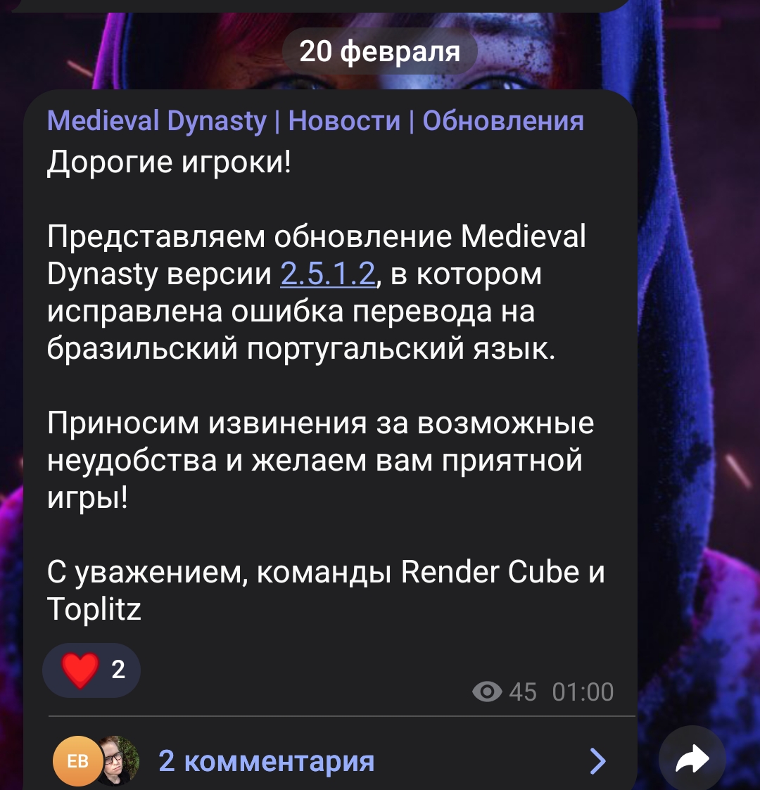 Игра «Медивал Династи» регулярно получает новые патчи, оптимизацию баланса, запускаются кооперативные режимы для совместной игры. Активно внедряются новые постройки, элементы хозяйства, переработка дерева, одежды, еды и другие возможности для развития поселения.