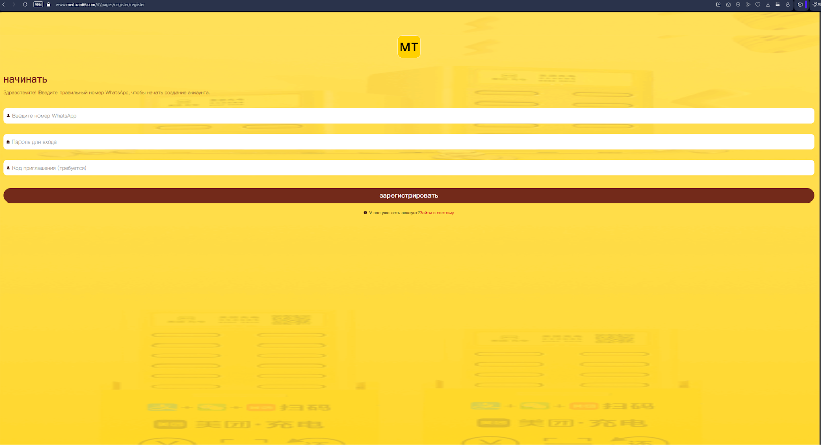 Сервис Мейтуан 66 является одной из площадок-клонов Meituan, поэтому из данных в интернете можно предположить, что регистрация открывает личный кабинет с тремя ключевыми блоками: баланс, аренда оборудования и командные бонусы. Заметим, что без реферального кода авторизация недоступна.