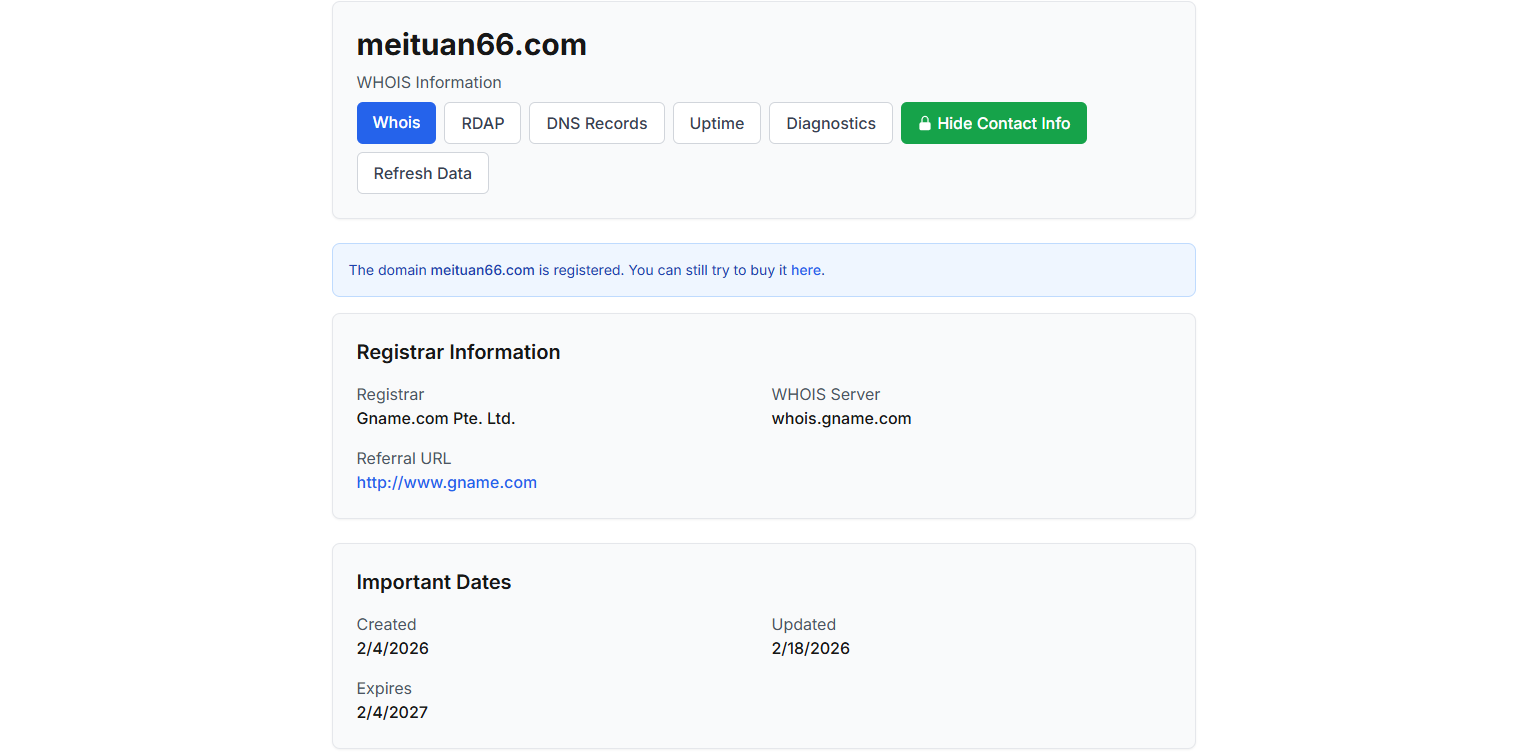 По информации Whois, домен площадки был зарегистрирован в феврале 2026 года через регистратор Gname. Данные владельца и расположение серверов скрыты приватной регистрацией, поэтому выяснить, кому принадлежит Meituan 66 и откуда им управляют сложно. Также заметим, что основной сайт проекта сразу перекидывает пользователю на окно регистрации, поэтому изучить наличие лицензий, документации и официальную регистрацию не получится.