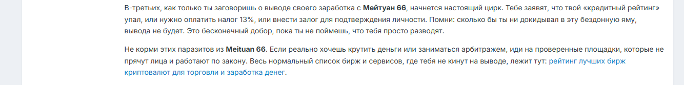 В сети мало упоминаний о «Мейтуан66», но большинство негативные. Пользователи сообщают, что мелкие выплаты иногда проходят, но крупные суммы застревают в обработке. Также в отзывах о Meituan66 com встречаются обвинения в мошенничестве и заявления о том, что это пирамида.