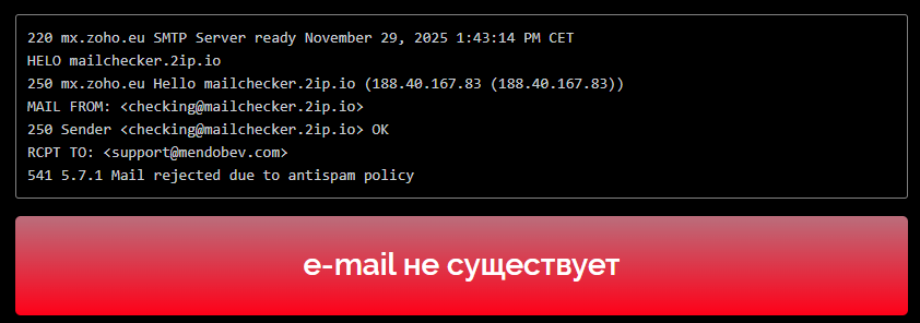 Контакт для связи — support mendobev com. Показательно, что этот e-mail не существует.