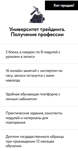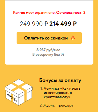 Стоимость обучения на апрель 2026 года составляет ₽214,499 и на сайте указано, что осталось якобы 2 места. При его покупке студент дополнительно получает чек-лист «Как начать инвестировать в криптовалюту» и журнал трейдера.