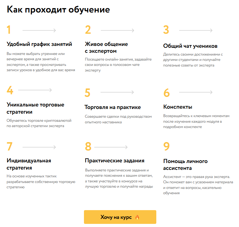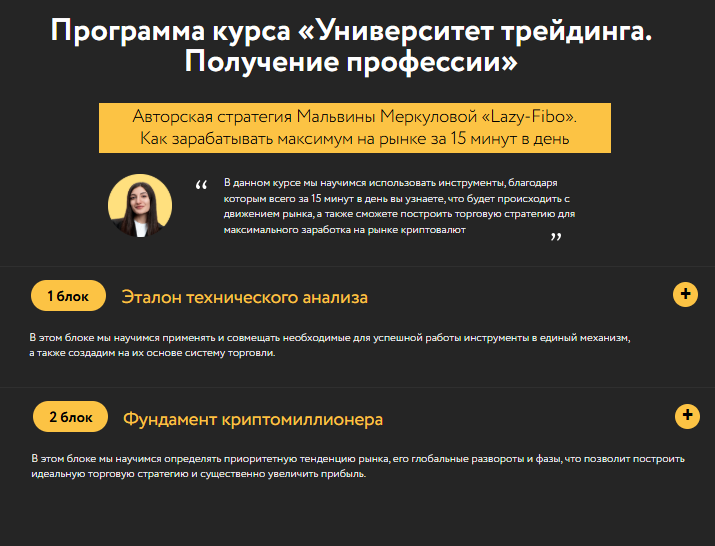 Обучение состоит из 2 блоков – «Эталон технического анализа» и «Фундамент криптомиллионера». В каждом из них по 8 модулей, но они подробно не описаны.