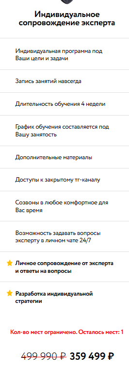 Кроме того, за ₽359,499 можно купить личное сопровождение от Меркуловой Мальвины Каремовны, программу которого она составляет под запрос ученика и все записи занятий у него остаются навсегда.