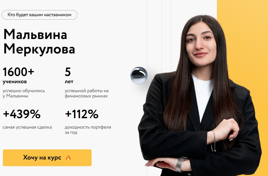 Меркулова Мальвина Каремовна не фигурирует в Сети как крутой трейдер, потому что отзывы на ее курсы не оставляют. В обзоре мы расскажем, что входит в программу обучения и постараемся понять, стоит ли его покупать.