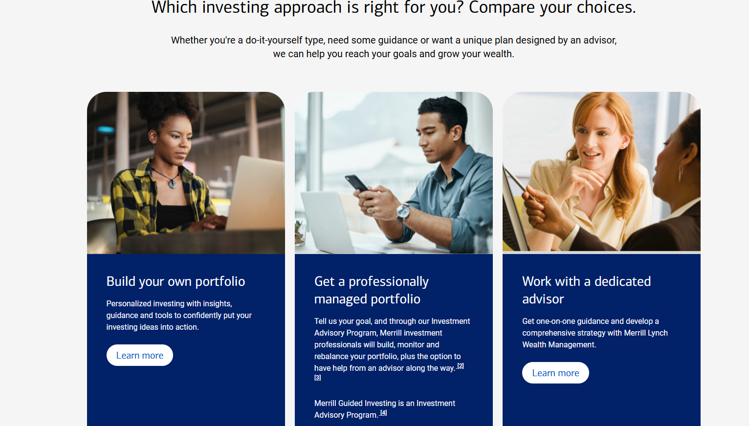 Merrill Lynch предлагает услуги для разных типов инвесторов. Если любите сами разбираться, есть онлайн-платформа. На ней можно торговать акциями, ETF и облигациями. Еще доступна торговля опционами с маржинальным кредитом.