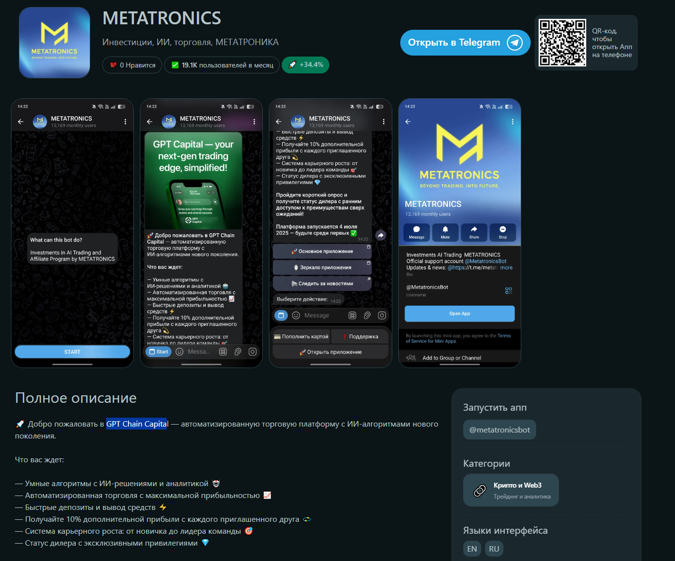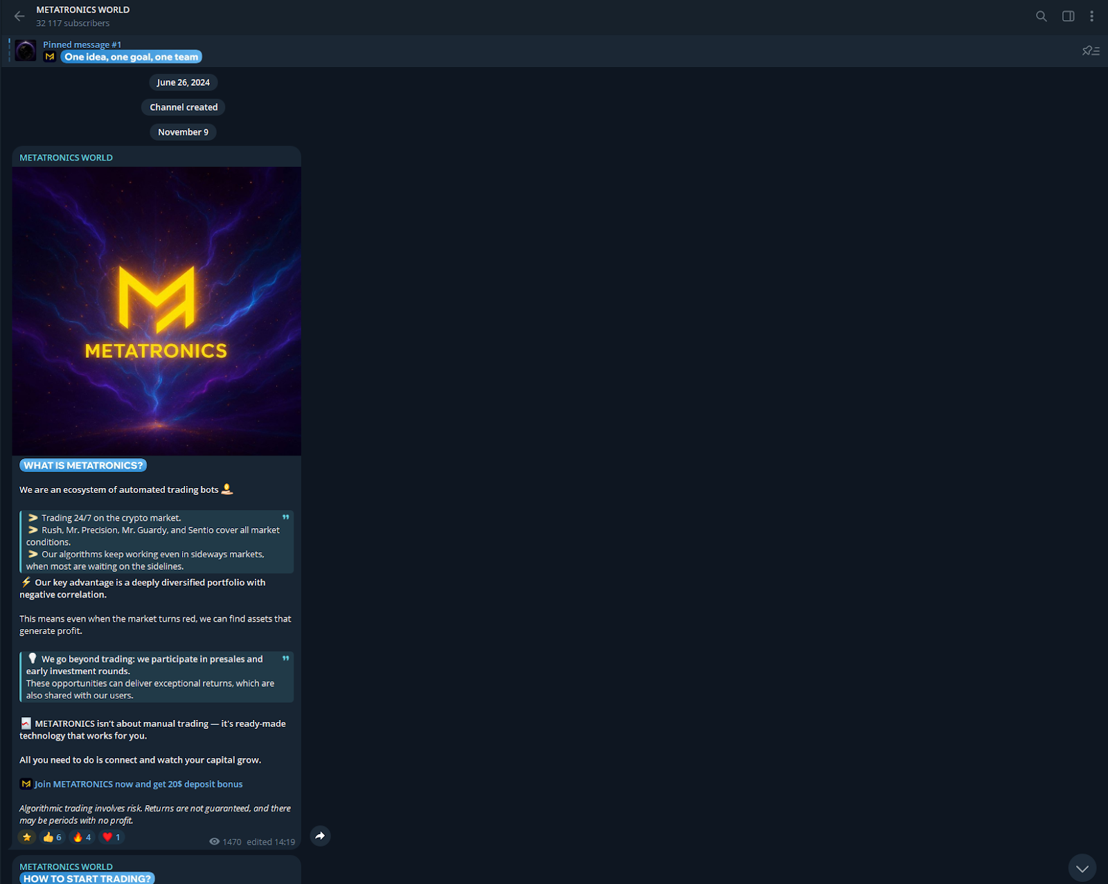 MetatronicsBot — очередная мутная схема: ни лицензий, ни имен, ни гарантий. Деньги вкладываешь, а куда они идут — одному богу известно. Пахнет разводом.